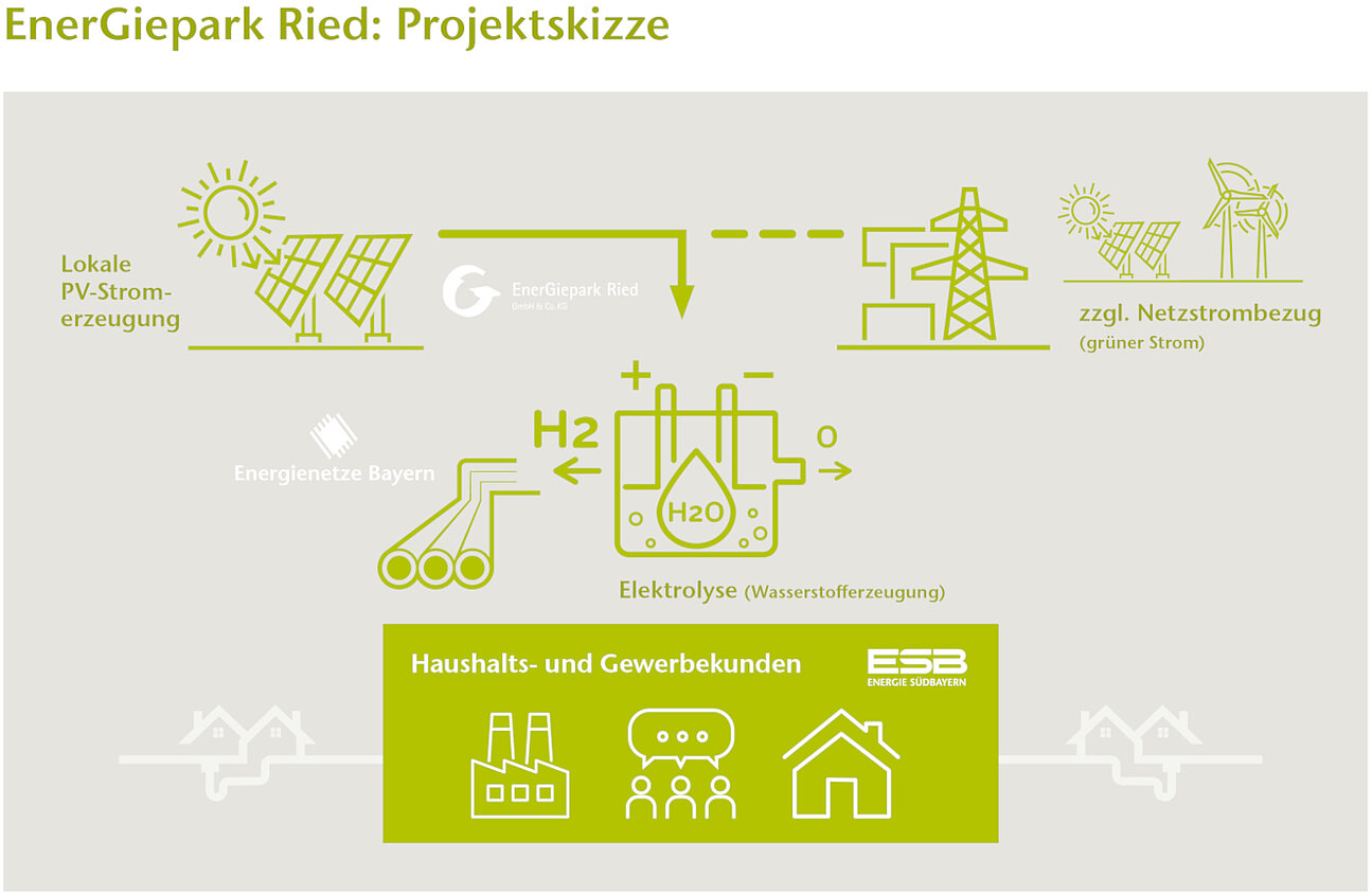 Mit H2Ried startet ein innovatives Pilotprojekt in den Landkreisen Dachau und Freising. Vor Ort wird ein Elektrolyseur errichtet, in dem grüner Wasserstoff erzeugt wird, vorrangig mittels lokalem Sonnenstrom. Dieser regionale Wasserstoff wird dann in das bestehende Erdgasnetz eingespeist.